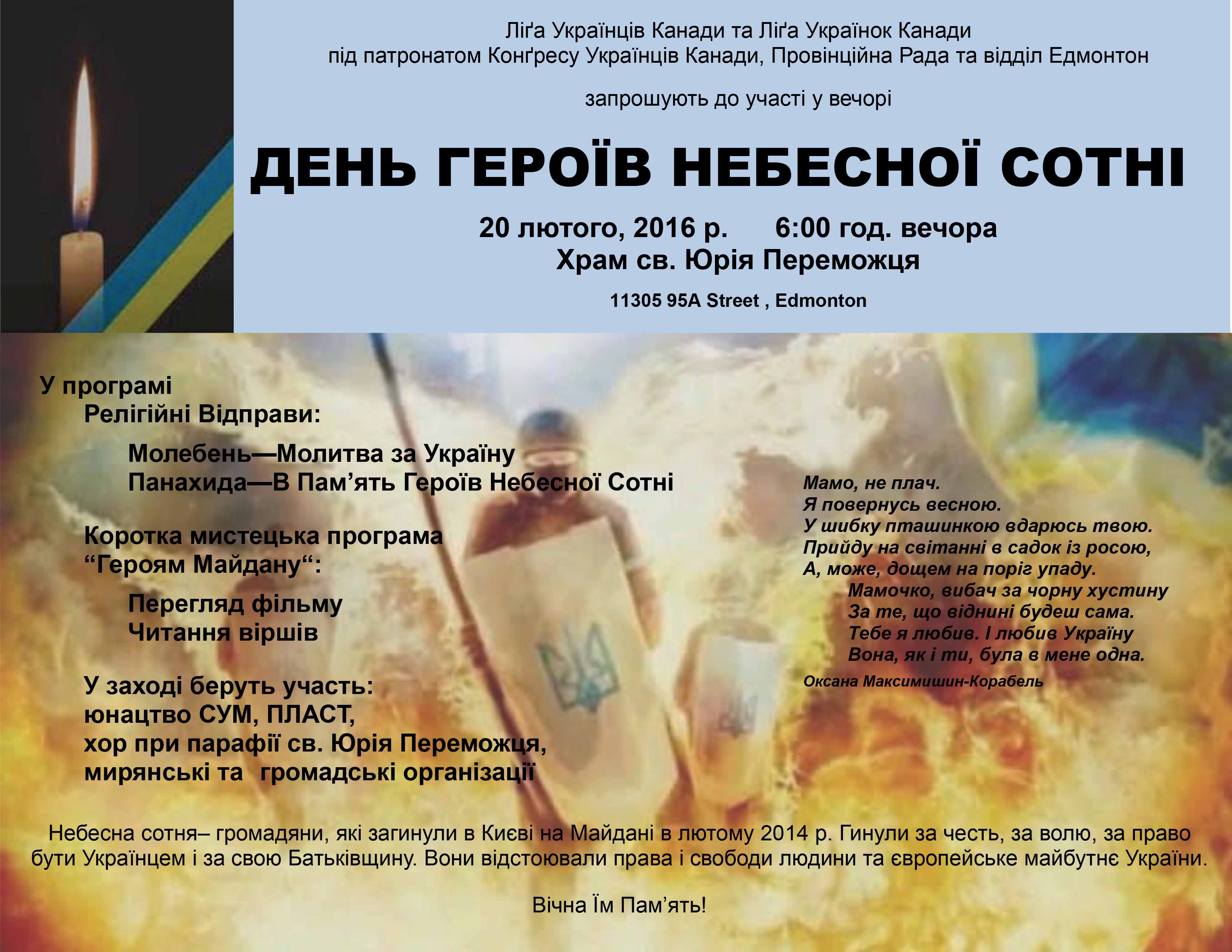 Вже два роки пройшло від трагедії яка відбулася на Майдані в Києві. Загибель Небесної Сотні залишиться одна з найбільш пам`ятних i важних моментів в історії Незалежної України і для всього Українського народу. Ліґа Українців Канади і Ліґа Укараїнок Канади (в Едмонтоні) влаштовують вечір пам`яті Небесної Сотні із Молебнем і панахидою в другу річницю цієї події. Просимо всіх прийти вшанувати пам`ять сучасних героїв України які загинули на майдані і на війні проти російського агресора. Прошу розширити цю інформацію знайомим.