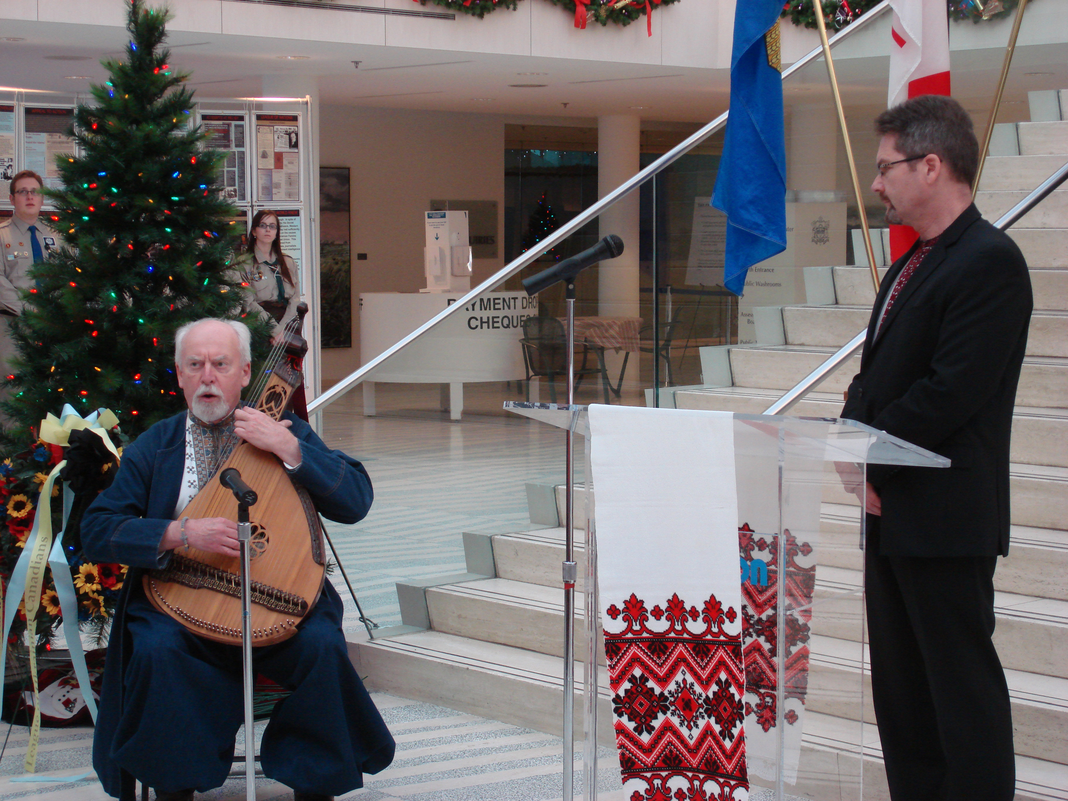 Photo – Serhiy Kostyuk. Dr. Hornjatkewych plays and sings a lament in memory of the kobzari. A lament, a song of grief, that describes that day in about 1935 when hundreds of kobzari gathered outside of Kharkiv, Ukraine’s capital city, under the guise of a kobzar’s convention. The kobzari were all executed, their bodies thrown into a pit and forgotten.