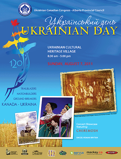 The Ukrainian Canadian Congress-Alberta Provincial Council, partnering with the Ukrainian Culutral Heritage Village, invites everyone to attend the annual Ukrainian Day Festival at the Ukrainian Village on Sunday August 7, and celebrate all things Ukrainian! This years’ theme of ”Kanada-Ukraina 120: Groundbreakers-Nation-Builders-Trailblazers” will be in celebration of the 120th anniversary of Ukrainian settlement in Canada, and will set the tone of the event reflecting both the cultural history and current reality of Alberta’s Ukrainian Canadian Community. UCC-APC is also honoured to announce that the Honourable Premier Ed Stelmach, the first Alberta Premier of Ukrainian ancestry, will attend this year’s Ukrainian Day as a special guest. Other federal, provincial, and municipal representatives will also be in attendance…