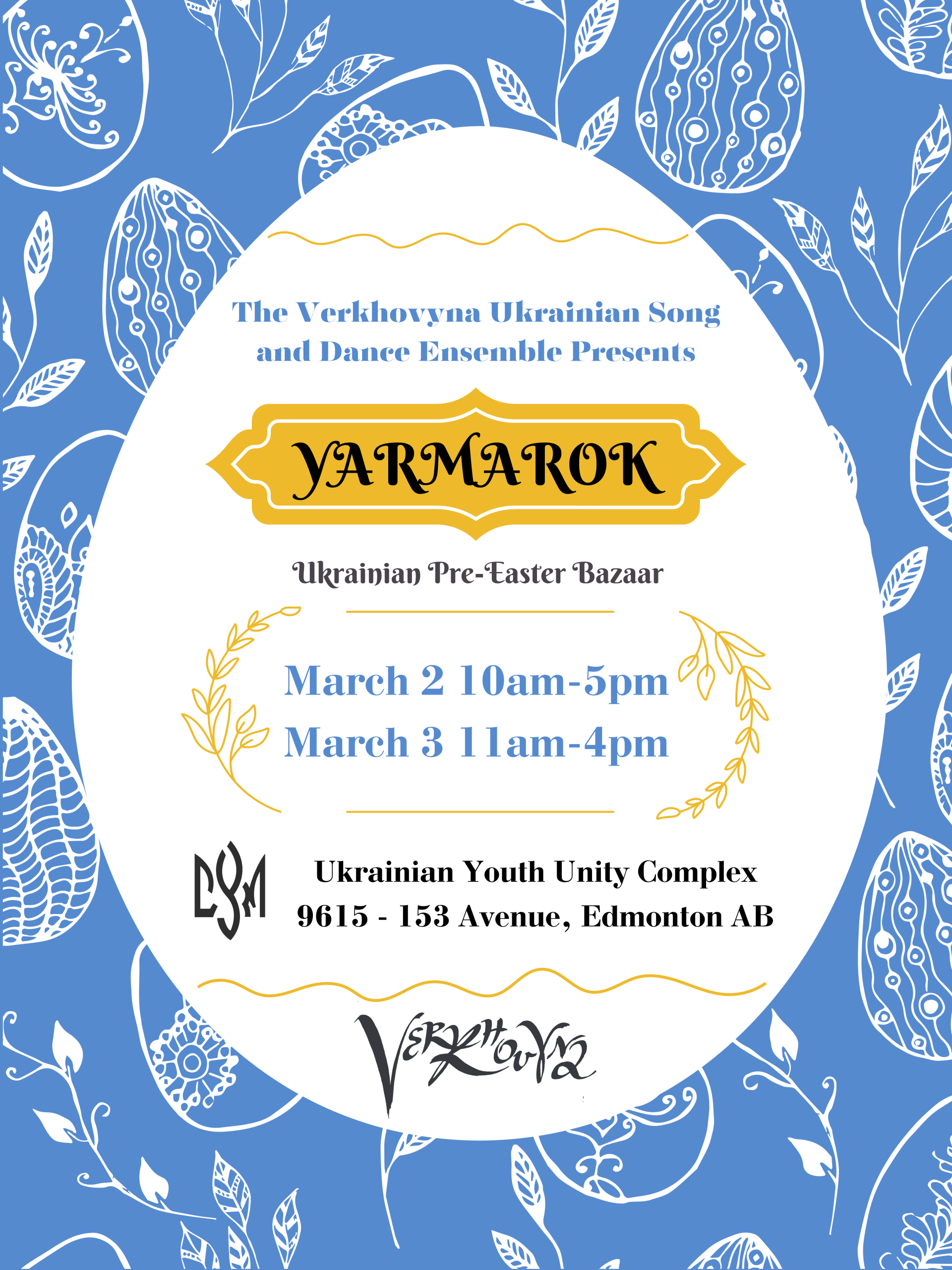The Verkhovyna Ensemble presents their pre-easter bazaar, Yarmarok. It features live performers, a vendor market, bake sale, and delicious Ukrainian cuisine. And best of all; kids activities, including inflatables, a petting zoo and more! This takes place March 2nd and 3rd at the Ukrainian Youth Unity complex.