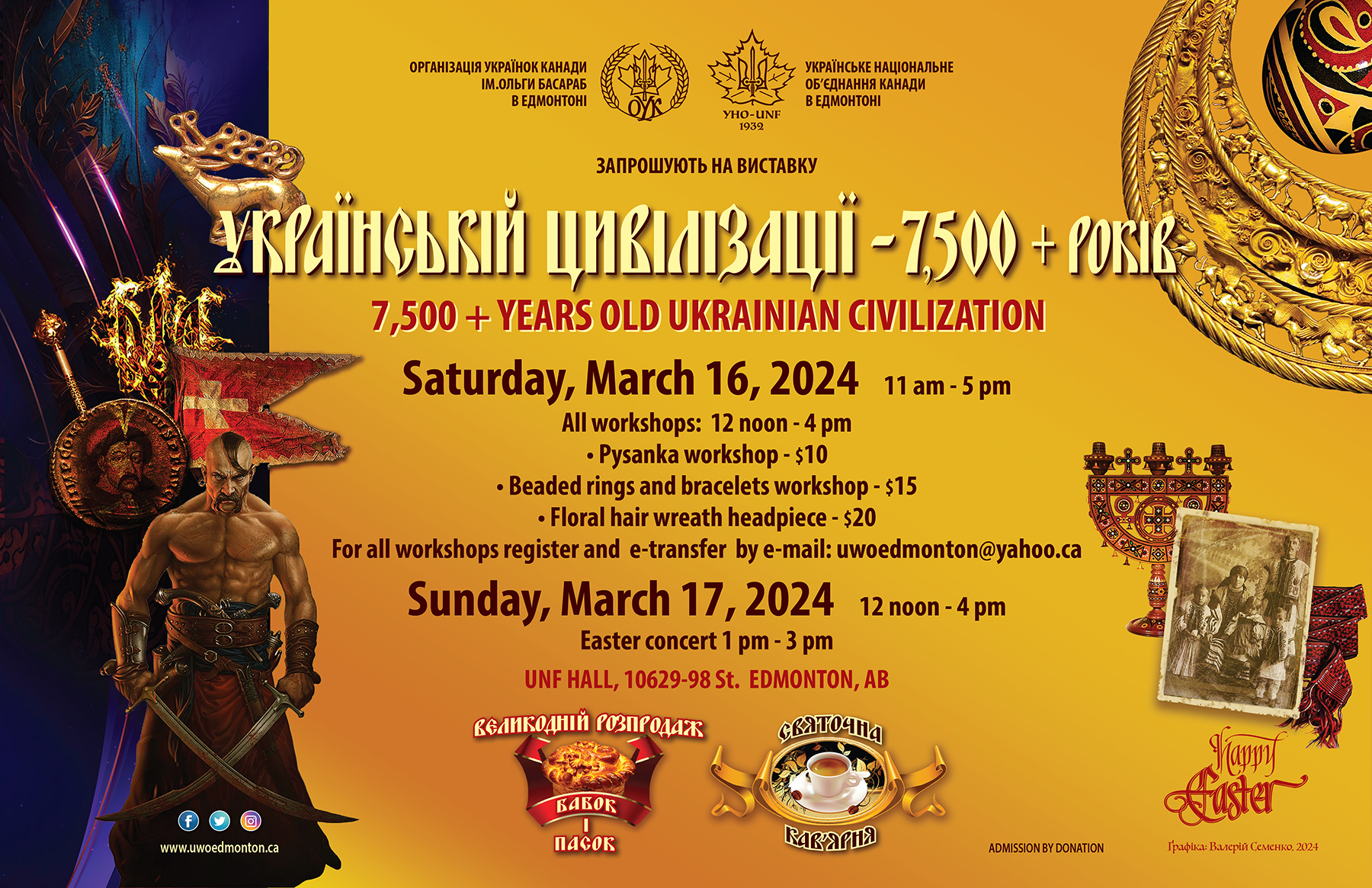Ukrainian Women's Organization of Canada in Edmonton and Ukrainian National Federation, Edmonton branch present an exhibit " 7500+ years old Ukrainian Civilization", which takes place on April 16 & 17, 2024 at UNF Hall. The first part of this exhibition was shown in the Ukrainian art pavilion during the Heritage Days 2023 and received very… Continue reading Easter Exhibit “7500+years old Ukrainian Civilization”