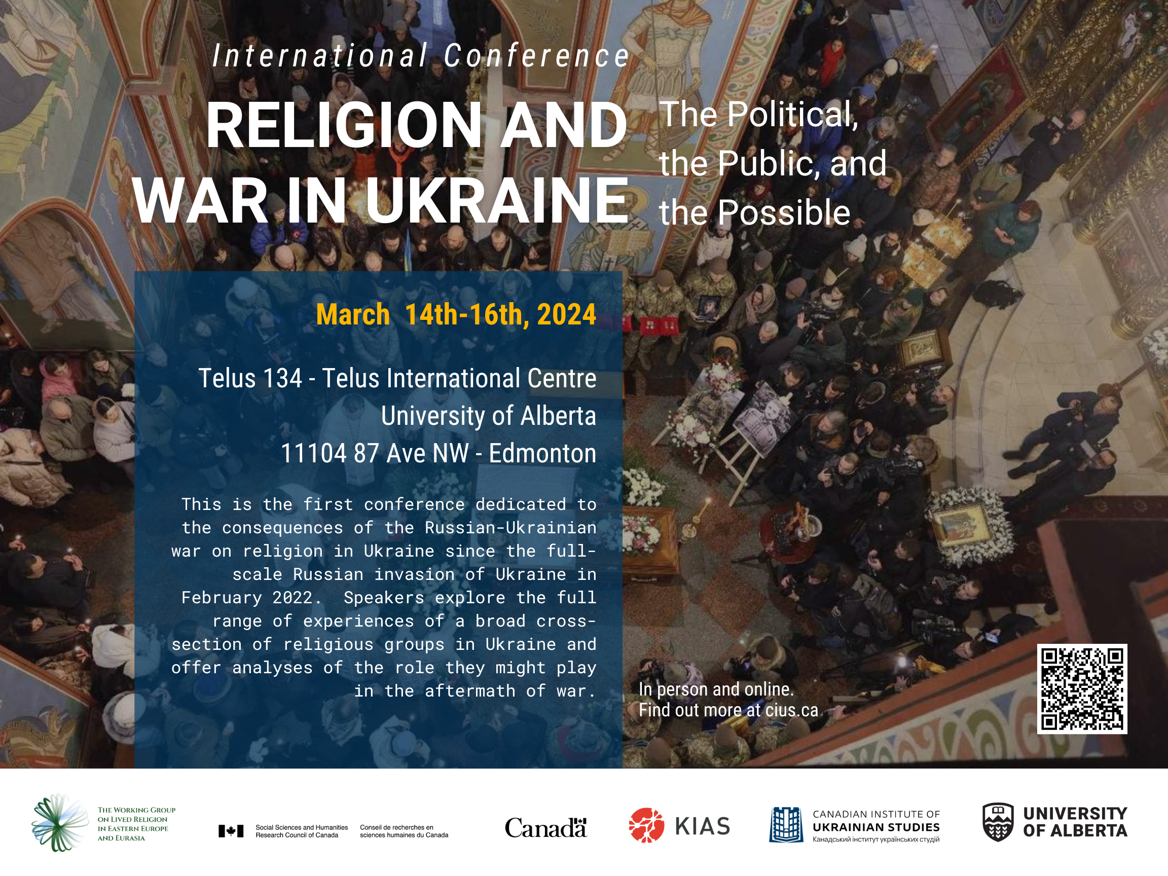 International Conference Religion and War in Ukraine: The Political, the Public, and the Possible 14-16 March, 2024 Telus International Centre, Room 134 University of Alberta 11104 87 St NW, Edmonton Religion has served as a basis for nation-building and decolonization, state-building, and humanitarian relief. It has also been the source of social and political polarization.… Continue reading International Conference – Religion and War in Ukraine: The Political, the Public, and the Possible