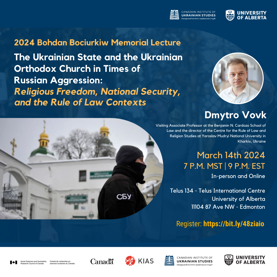 The Ukrainian State and the Ukrainian Orthodox Church in Times of Russian Aggression: Religious Freedom, National Security, and the Rule of Law Contexts with Dr. Dmytro Vovk 14 March, 2024 7 P.M. MT Telus International Centre, Room 134 University of Alberta 11104 87 St NW, Edmonton In this lecture, Dmytro Vovk will analyze the legal… Continue reading 2024 Bohdan Bociurkiw Memorial Lecture