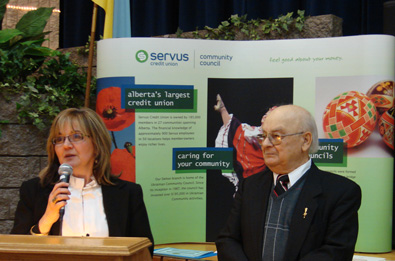 I am honoured to bring greetings on behalf of the Ukrainian Canadian Congress Alberta Provincial Council. This is particularly special because this evening we are welcoming new individuals and families not only to Edmonton, Alberta and Canada, but to a very active and proud Ukrainian community. Before I say a few words to our special guests and new families here tonight, on behalf of our entire Board of Directors, and all of us gathered this evening, I would like to recognize the tremendous work of Mr. Bill Diachuk. As he mentioned he is going to become past president of Ukrainian Canadian Social Services, but his legacy will live on. He has been very dedicated, hard working and caring in his work with the organization and we wish him all the best as he takes more time for his wife and family.