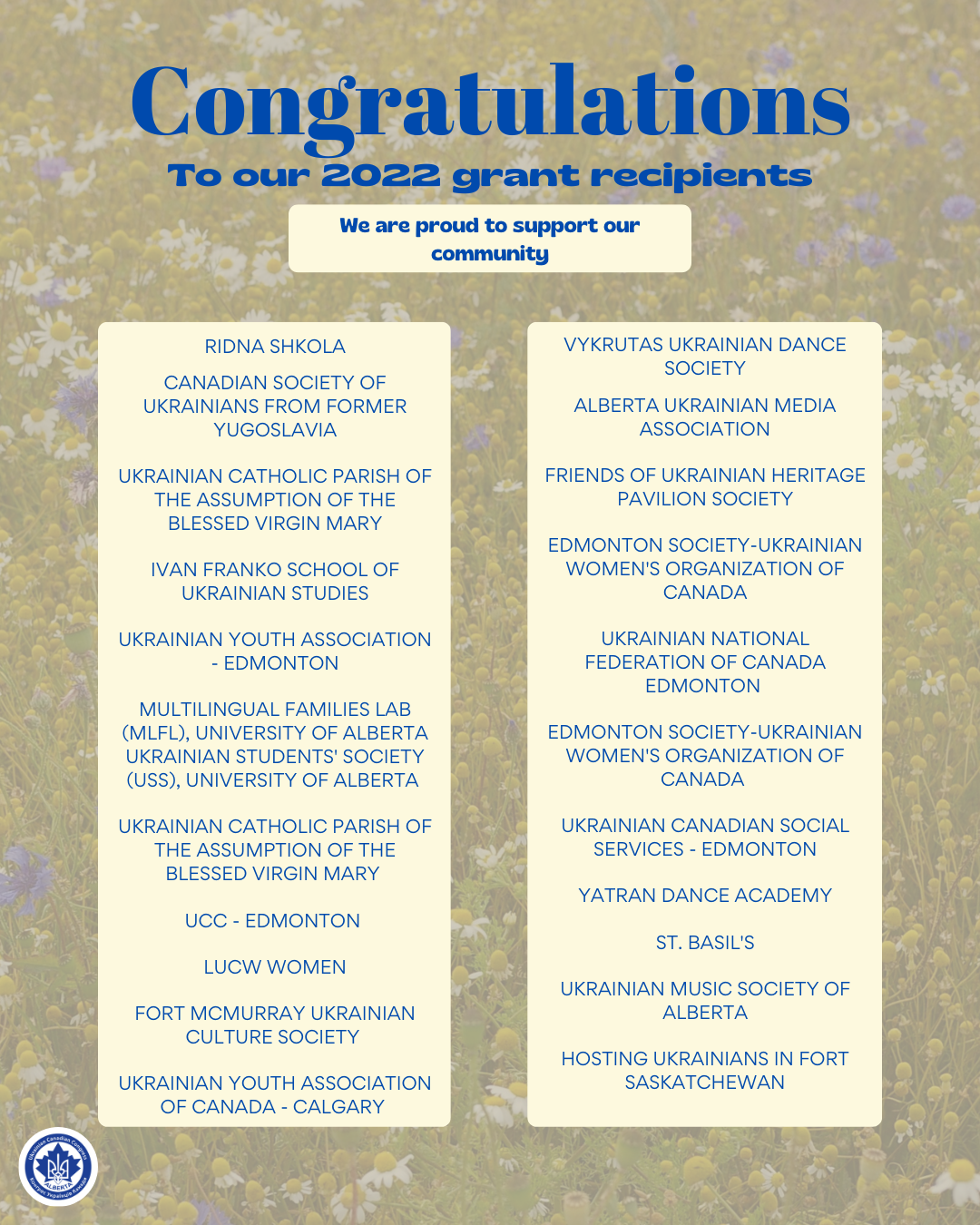 Multilingual Families Lab (MLFL), University of Alberta Ukrainian Students’ Society (USS), University of Alberta – $2000