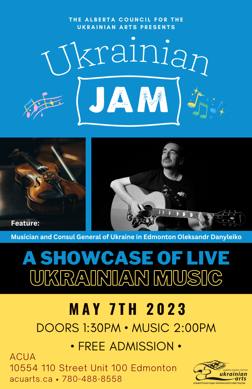 ACUA 10554 110 Street Unit 100, Edmonton, Alberta, CanadaWe are pleased to announce that our next Ukrainian Jam, happening Sunday May 7th at ACUA, among other acts will feature musician and Consul General of Ukraine in Edmonton Oleksandr Danyleiko! Come out for a relaxed afternoon of live Ukrainian music: Admission is free and everyone is welcome! UKRAINIAN JAM 🇺🇦 A showcase of live… Continue reading Ukrainian Jam • A Showcase of Ukrainian Music