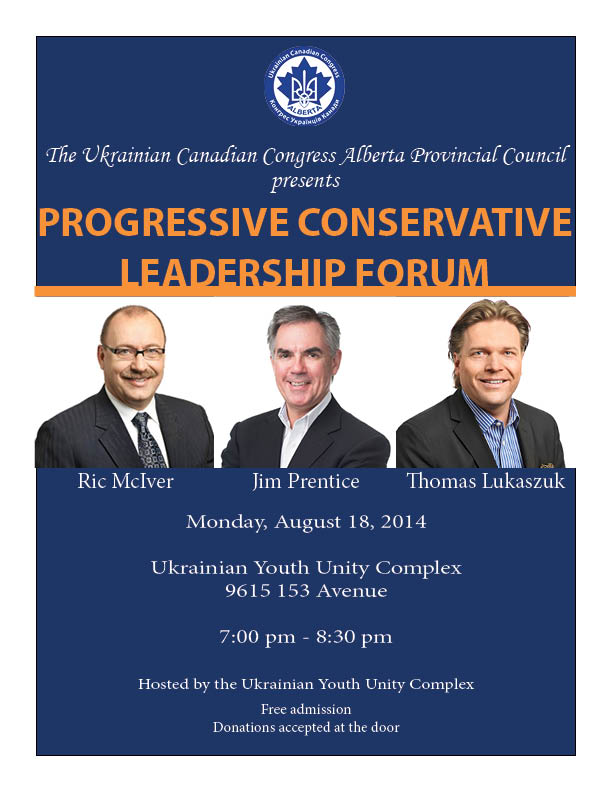 Please come to our PC Leadership Forum, and meet the candidates for the leadership of the Progressive Conservative Party, Jim Prentice, Thomas Lukaszuk, and Ric McIver