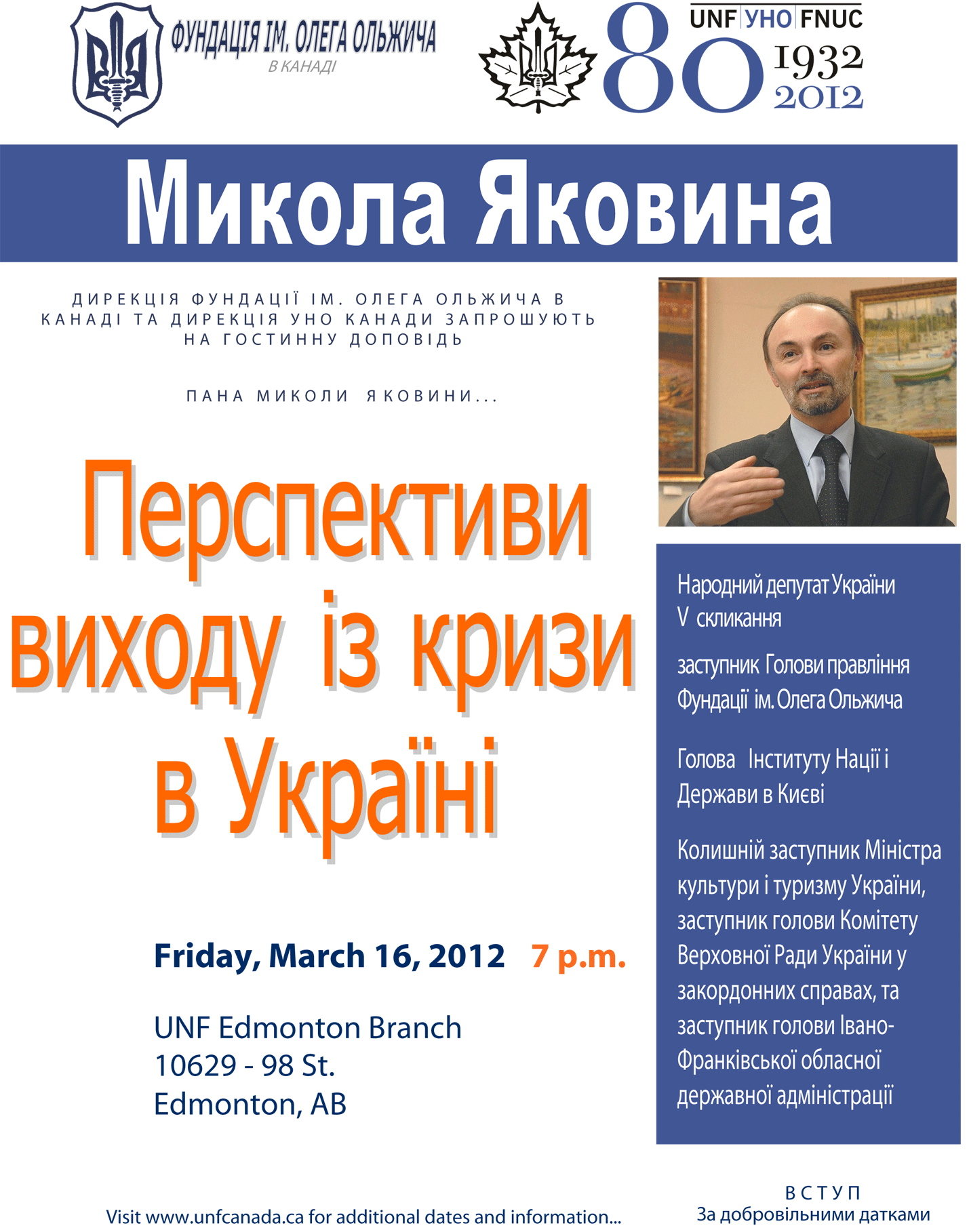 Oleh Olzhych Foundation of Canada and Ukrainian National Federation of Canada Present Mr. Mykola Yakovyna (Ukraine) on A speaking Tour of Canada…