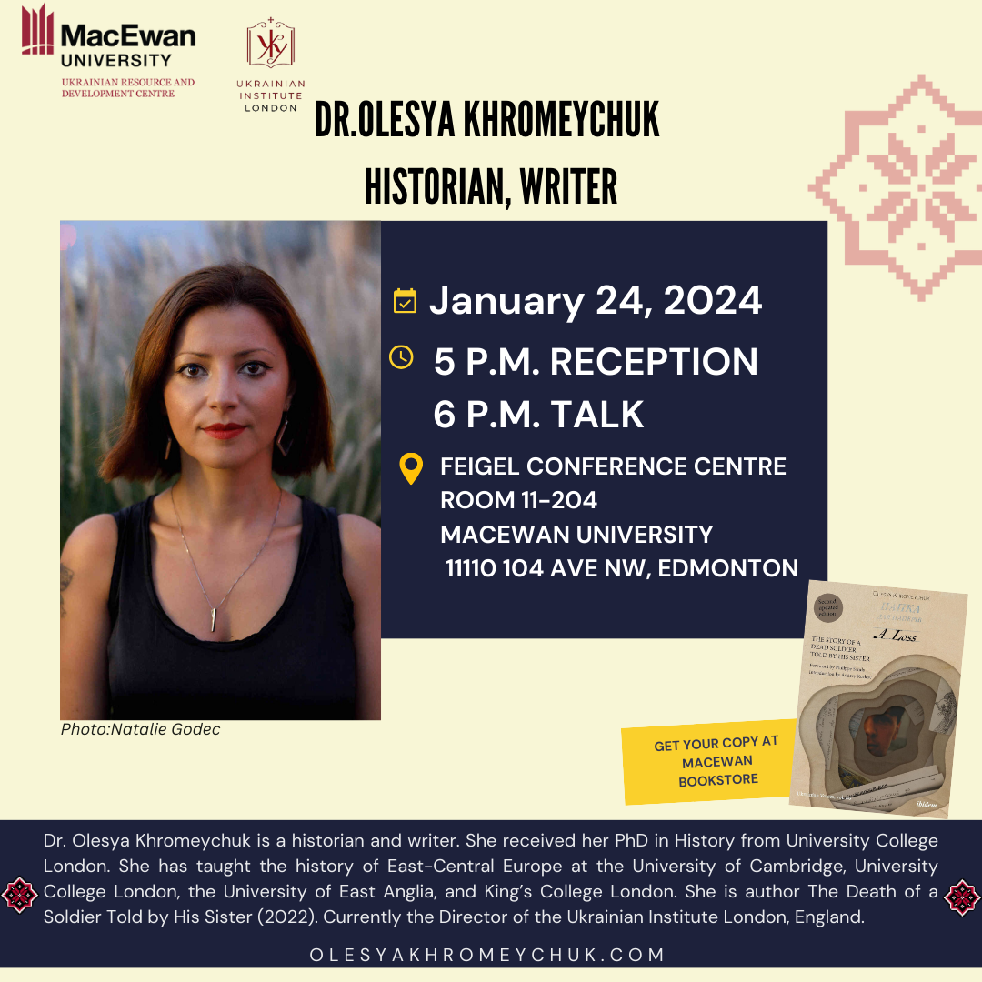 MacEwan University is honoured to host an enlightening talk by Dr. Olesya Khromeychuk, a historian, writer, and the Director of the Ukrainian Institute in London, England. Dr. Khromeychuk is a prominent voice in unravelling the complexities of the war in Ukraine, with her academic contributions spanning in-depth analyses of wartime experiences, memory studies, and the… Continue reading Talk by Dr. Olesya Khromeychuk